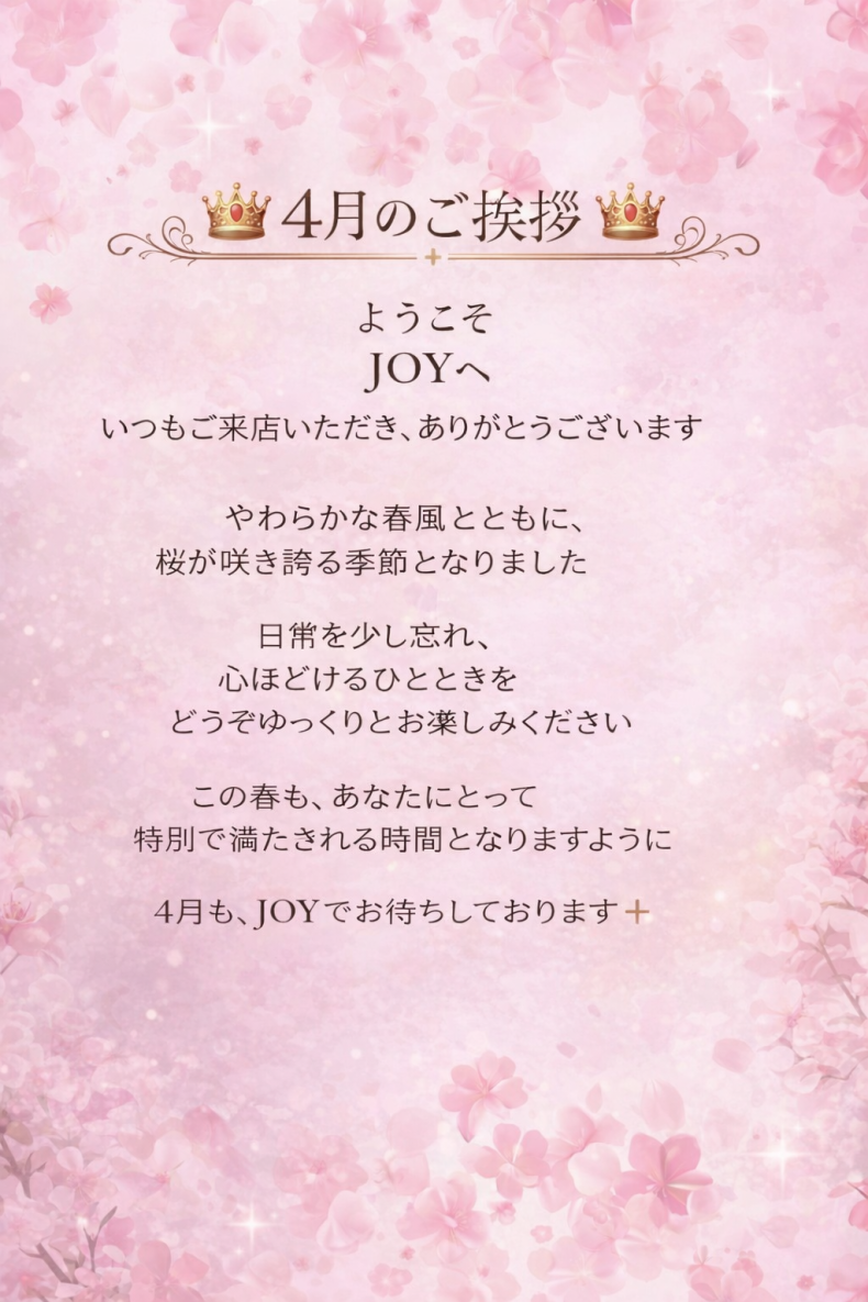 店長🌸4月のご挨拶🌸こんにちはいつも JOY をご利用いただきありがとうございます。やわらかな春風とともに、桜がふんわりと咲き誇る季節となりました日常を少し離れ、心ほどけるひとときをぜひ JOY でお過ごしください。この春も、皆さまにとって特別で心満たされる時間となりますように4月もどうぞよろしくお願いいたします✨